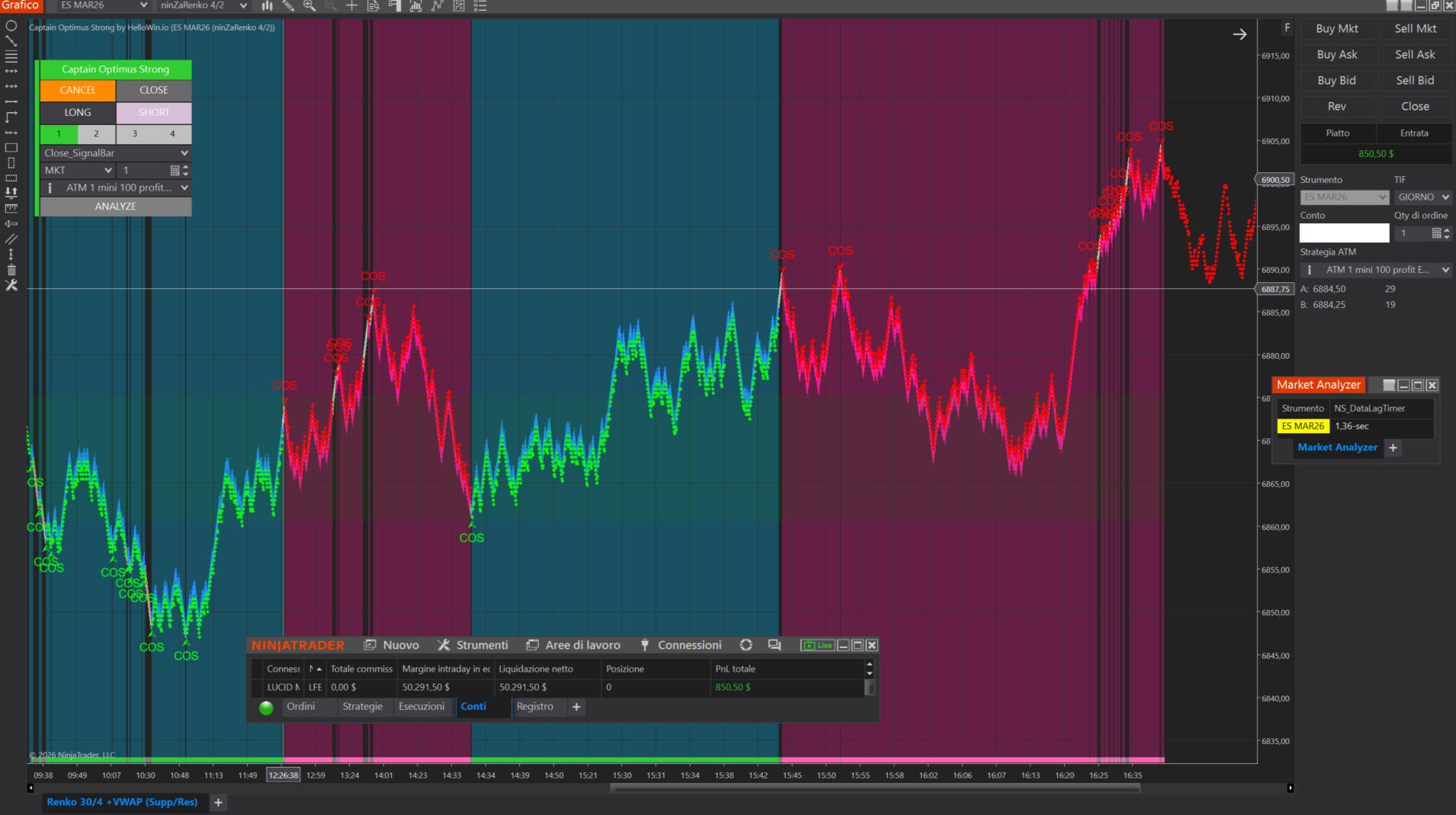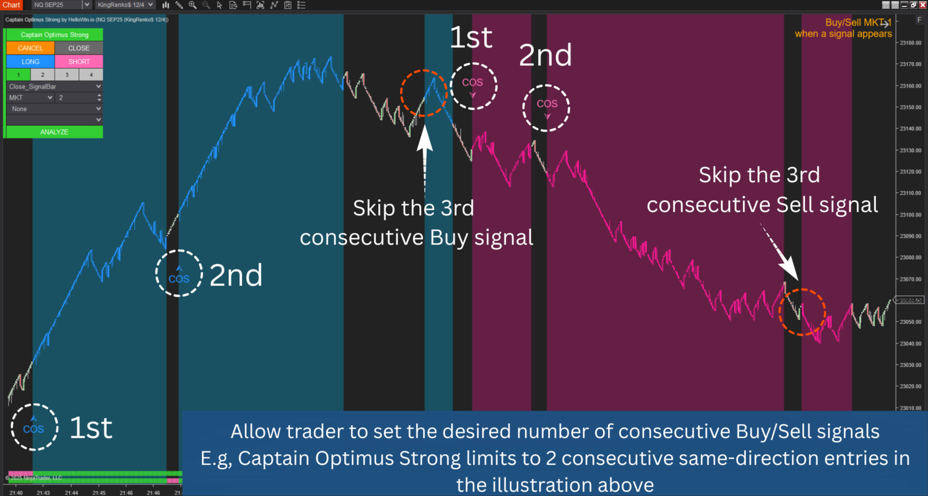 Thanks to its AutoSync Signal Engine, Captain Optimus Strong continuously monitors 5, 10, 15 – or even more – indicators and trading systems using Dedicated NinjaScript Signals.It automatically finds aligned signals, filters out conflicting ones, and displays the consensus on the chart in just 2 seconds – a process that would otherwise take at least 3 minutes by hand.