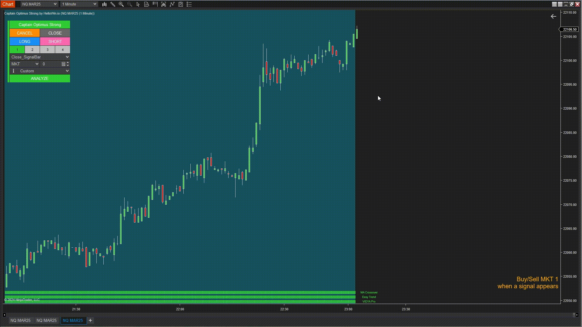 Thanks to its AutoSync Signal Engine, Captain Optimus Strong continuously monitors 5, 10, 15 – or even more – indicators and trading systems using Dedicated NinjaScript Signals.It automatically finds aligned signals, filters out conflicting ones, and displays the consensus on the chart in just 2 seconds – a process that would otherwise take at least 3 minutes by hand.